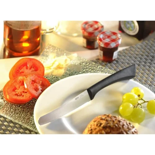 Pour couper les petits pains ou les tomates, par exemple.- Manche ergonomique en matière plastique;Partie inférieure caoutchoutée pour une bonne tenue- Longueur de la lame : 11 cmGarantie : 5 ansMatière principale : Lame en acier de haute qualité