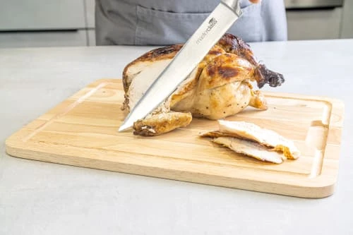 La planche à découper en bois Kitchen Craft est la reine des cuisines! Toujours aussi fiable et résistante, elle vous transforme en vrai Top Chef. Que ce soit pour découper votre viande, volaille, fruits ou légumes; son format avec rebord préservant les fuites la rend indispensable dans chaque cuisine. Conçue à base de bois d’hévéa, elle est ultra résistante et respecte la planète. Aucune trace de BPA (Bisphénol A) contrairement à la plupart des planches. Outre sa fonction de planche à découper, elle peut également servir de plateau de fromage, charcuterie ou tout autre aliment grâce à sa légère encoche pour faciliter une prise en main facile.