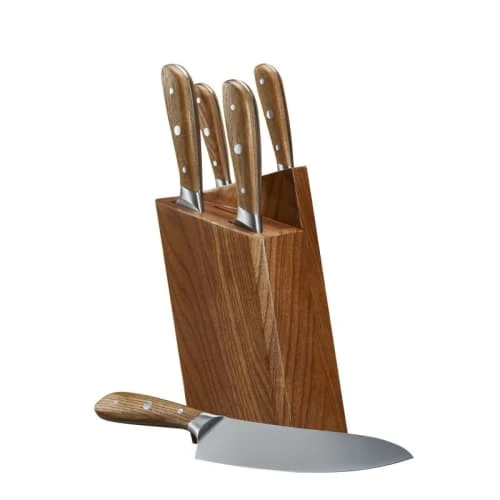 Bloc de 5 couteaux de cuisine de la gamme Tsukiji : couteau d’office, couteau utile, couteau Santoku, couteau à pain et couteau de chef. Manches et bloc naturels en bois de frêne fumé, résistant et durable.Tsukiji incarne une cuisine saine et naturelle. Un design japonais et épuré qui associe un bloc aux formes structurées, à des couteaux aux manches harmonieusement arrondis.Les couteaux de Chef Sabatier Trompette ont été développés pour répondre aux exigences spécifiques de la préparation culinaire. Les lames des couteaux sont en acier inoxydable Molybdène vanadium de grande qualité avec un pourcentage élevé de carbone. Ces aciers confèrent aux produits leurs qualités de résistance, dureté, inoxydabilité, anti-corrosion et tranchant.