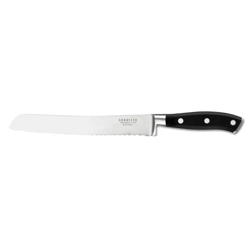Couteau à pain de la gamme Vulcano. Lame 20cm en acier haute performance MoV – Molybdène Vanadium. Le dos de lame est arrondi, pour un confort de coupe optimal. Le fil de la lame est poli au cuir pour un tranchant rasoir. La mitre, les rivets et la soie sont en acier inox 18/0. Nous recommandons d’essuyer le couteau après lavage – machine ou main – pour en prolonger indéfiniment l’usage.La collection Vulcano décline 8 couteaux de cuisine haute performance. Les manches sont moulés en polymère haut de gamme dont le volume permet une prise en main ferme et sécurisée. La garde du manche offre une protection maximale lors de la découpe. Les couteaux Vulcano sont pourvus d?une mitre en inox.La marque Sabatier Trompette est née au début du 18ème siècle dans le bassin de Thiers, capitale de la coutellerie en France. Les gammes de couteaux de la marque Sabatier Trompette répondent aux usages spécifiques de la préparation culinaire. Forme de la lame, ergonomie du manche, faible poids et parfait équilibre sont étudiés afin d?obtenir des outils parfaits pour les Chefs amateurs ou confirmés.