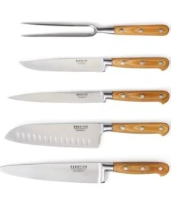 Set 5 pièces de la gamme Essentiel : Couteau et Fourchette à découper 15.5cm, Couteau filet poisson / viande 18cm, Santoku 17.5cm, Couteau de chef 20cm. Acier haute performance MoV – Molybdène Vanadium. Le dos de lame est arrondi, pour un confort de coupe optimal. Le fil de la lame est poli au cuir pour un tranchant rasoir. La mitre, les rivets et la soie sont en acier inox 18/0.La collection Essentiel est une gamme authentique et naturelle dont le manche est façonné en bois de pakka. Le bois est enrichi de résine antibactérienne. Le dessin traditionnel de la gamme, avec 3 rivets et une mitre en inox, répond aux usages culinaires exigeants : performance et précision de coupe, confort en main pour un geste maîtrisé, robustesse et facilité d’entretien. Nous recommandons d’essuyer le couteau après lavage – machine ou main – pour en prolonger indéfiniment l’usage.Les couteaux de Chef Sabatier Trompette ont été développés pour répondre aux exigences spécifiques de la préparation culinaire. Les lames des couteaux sont en acier inoxydable Molybdène vanadium de grande qualité avec un pourcentage élevé de carbone. Ces aciers confèrent aux produits leurs qualités de résistance, dureté, inoxydabilité, anti-corrosion et tranchant.