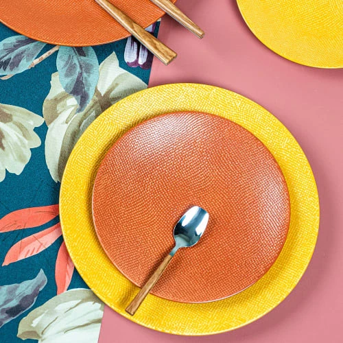 La collection vésuvio se décline en plusieurs coloris tout de grès vêtus. son aspect satiné et ses motifs en reliefs donnent du caractère à cette collection.vous pouvez également assortir ces assiettes à dessert déclinées ici en ocre rouge avec les autres produits de la gamme et mixer les couleurs pour un effet tendance. découvrez les bols, les saladiers ou encore les tasses à café avec leur soucoupe en grès. (lot de 6)Collection : Vésuvio Matière : Grès Couleur : Orange Diamètre : 21 cmCompatible Lave-vaisselle Compatible Micro-onde