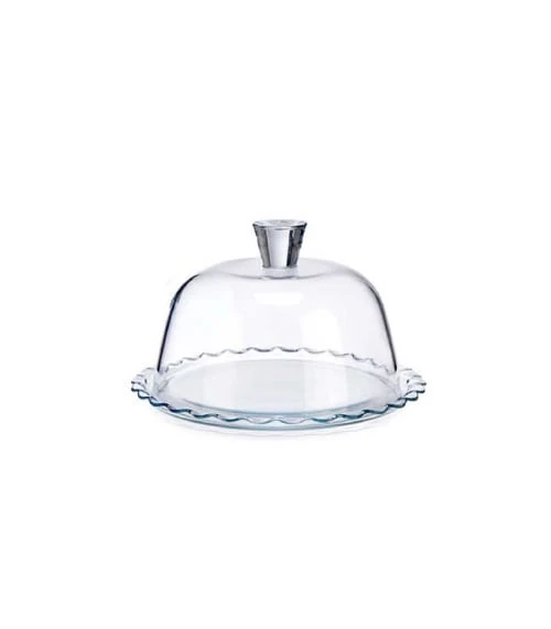 Plat présentoir pour pâtisserie avec cloche en verre. Dimensions: Hauteur 11.8cm x diamètre 26.4cm – Couleur: Transparent – Matière: Verre